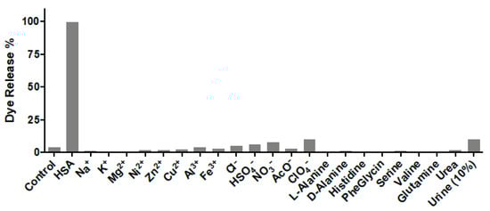 Then, the selectivity of S1 toward HSA was assessed by testing cargo release against common interfering molecules present in biological samples. Figure 4 shows the emission of rhodamine B (at 571 nm) released from S1 nanoparticles suspended in PBS (pH 7.4)-acetonitrile 95:5 v/v in the presence of HSA and other selected interfering molecules such as anions, cations, amino acids, urea (at 10 μM) and synthetic urine in PBS [43]. As could be seen, only HSA was able to induce pore opening and rhodamine B release. These results indicated the high selectivity achieved with S1 nanoparticles, as only the presence of HSA induced pore opening and rhodamine B release.
