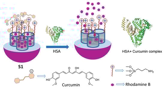 MCM-41 type MSNs were prepared using n-cetyltrimethylammonium bromide (CTABr) as template and tetraethylorthosilicate (TEOS) as a silica source [18,19] and then calcinated to remove the surfactant. MSNs were then loaded with rhodamine B, the loaded solid was reacted with (3-aminopropyl) triethoxysilane and, finally, the pores were capped by addition of curcumin (solid S1 in Scheme 1).