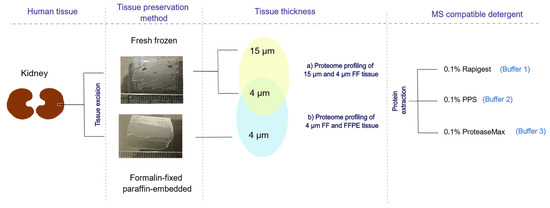 In this study, we analyzed biopsy-size tissue sections, which are 4 μm thick and are routinely used by pathologists world-wide. Our ambition was to develop fast and robust sample preparation for 4 μm thick human kidney biopsy tissues, ideally FFPE. We used both FF and FFPE tissues to investigate what difference could be found in protein detection between tissue storage types (Figure 1). Results showed that methods were sensitive enough to detect proteins from only several mm2 of 4 μm thick tissue. To investigate sensitivity and reproducibility related to the amount of tissue, 4 μm thick FF tissue was compared to 15 μm thickness of the same tissue. Further, we investigated the proteome profile of paired 4 µm FF and FFPE tissues to determine if 4 µm FFPE tissues were suitable for diagnostic and classification purposes. Similar physicochemical properties in terms of distribution of molecular weight, GRAVY score, and pI values were detected for proteins in both tissue types, whereas most of the proteins (265 ± 44) were detected in 4 µm thick when PPS was used.