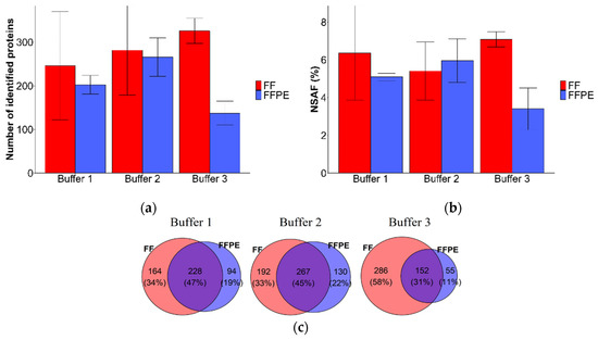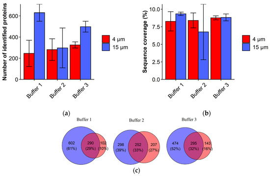 Qualitative and quantitative comparison of the proteins extracted from 4 and 15 µm thick FF tissue using Buffers 1 to 3. (a) Number of identified proteins; (b) Sequence coverage; (c) Venn diagrams illustrating the distribution of all identified proteins between 15 µm (blue) and 4 µm (red) thick FF tissue. Results are shown as mean ± SD.