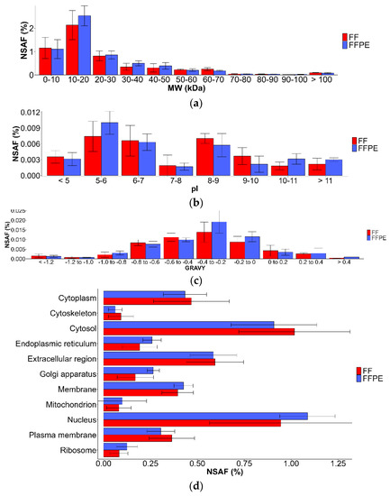 Comparison of NSAF values according to physicochemical properties of the identified proteins from 4 µm thick FF and FFPE tissue after the extraction with Buffer 2 according to: (a) MW, (b) pI, (c) GRAVY scores, and (d) cellular localization. NSAF values are expressed as a percentage of total proteins; results are shown as mean ± SD; (e) correlation of the protein abundance for proteins detected with Buffer 2 in 4 µm thick human kidney FF and FFPE tissues.
