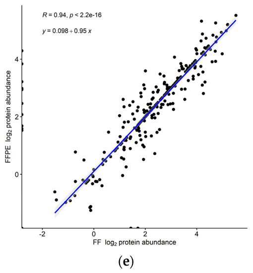 The physicochemical properties of the identified proteins extracted with Buffer 2 were evaluated in terms of molecular weight (MW) distribution, pI distribution, GRAVY scores, cellular localization, and K/R ratio. For both FF and FFPE tissues, the most abundant proteins are between 10 and 20 kDa mass range (Figure 4a). Proteins within the mass range 10–50 kDa had higher abundances in FFPE tissues compared to corresponding FF tissues. Further, as shown in Figure 4b, NSAF values were highest for proteins with pI values 5–6, followed by the proteins with a pI values of 6–7 and 8–9. Figure 4c shows the distribution of the identified proteins in terms of their GRAVY scores. The most abundant proteins were detected in the range −0.4 to −0.2 for both FF and FFPE tissue. FFPE samples contained a higher abundance of proteins in the range of −0.4 to 0 GRAVY score. The semi-quantitative distribution of the proteins was determined as their NSAF values according to their cellular localization (Figure 4d). Similar abundancies between the proteins were observed among FF and FFPE tissues, with proteins in the cytosol and nucleus having the highest abundance, while membrane proteins were slightly more abundant in FFPE samples which could be indication of good solubilization properties of Buffer 2. Cellular localization and NSAF values of the proteins identified in FF and FFPE tissues with Buffer 2 are shown in Supplementary Table S1. Moreover, further comparison showed good correlation of abundance of the proteins between FF and FFPE tissues (Figure 4e) which could indicate appropriateness of 4 μm FFPE tissues in this study.