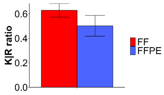 Further, results for the ratio of C-terminal lysine-containing peptides versus C-terminal arginine-containing peptides (K/R) are shown in Figure 5. Results show that K/R was decreased for FFPE compared to FF tissue which is in agreement with the previously published literature [29,30,31,32]. Underrepresentation of K residues due to the reaction of side chains with formaldehyde confirm that lysine side chains are more involved in cross-linking reactions with formaldehyde, to date mostly studied on tissues sections in the range of 8–60 μm [29,30,31], while previously for 3 μm tissues micro sized heat-induced antigen retrieval chamber was used [32].