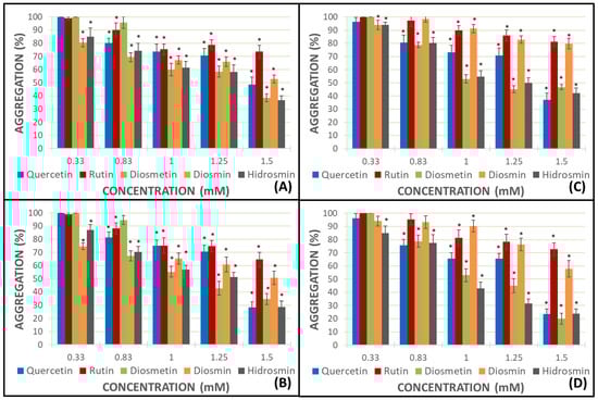 Heteroside flavonoids, rutin and diosmin, had an inhibitory effect amounting to 33.3% and 49.29%, respectively, in the presence of AA and PRP samples. The aglycones, quercetin and diosmetin, reached more effective results, namely, 71.51% for quercetin and 65.44% for diosmetin, at the same conditions; nevertheless, the heteroside hidrosmin achieved great data as aglycones (71.41%). The percentage of aggregation decreased as the concentration increased. There is a direct dose−response ratio. Thus, the highest results were obtained for quercetin, diosmetin, and hidrosmin at a 1.5 mM concentration in PRP samples with AA as the pro-aggregant agent (Figure 2D).