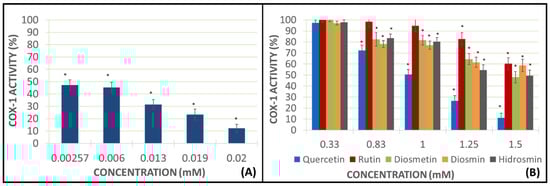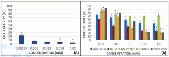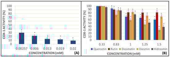 This diagram shows h-COX-1 works in presence of indomethacin as a positive control (panel (A)) and with different concentrations of each flavonoid (panel (B)). Error bars indicate the standard deviation. Color bars describe the mean and standard deviation for N = 8. * p < 0.05: significant variations of h-COX-1 in the presence or absence of the assayed compounds.