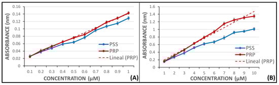 In order to extrapolate the release results of MDA, two calibration curves were performed at different concentrations of MDA, without pro-aggregant agent, in a UV/VIS Philips PU 8700 spectrophotometer (Inycom, Madrid, Spain). The samples were made in PSS as well as in PRP. The range of the calibration curves were 0.1–1 µM and 1–10 µM. Both curves showed regression coefficients near 1 (Figure 6).