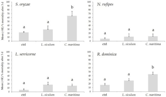Mean (+SE) % adult mortality after three days (d) from treatment determined by Calendula incana subsp. maritima and Laserpitium siler subsp. siculum toward Sitophilus oryzae, Necrobia rufipes, Lasioderma serricorne, and Rhyzoperta dominica. Different letters indicate statistically significant differences (p < 0.05) among the treatments (one-way ANOVA, followed by Tukey’s test).
