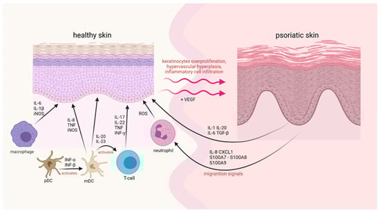 The increased number of myeloid dendritic cells (mDCs) in psoriasis may drive the immunopathological process by releasing IL-8 and TNFα and promoting T-cell proliferation in response to oxidative stress [67,68,69]. Oxidative conditions also support Th1 cells development. Consequently, higher levels of Th1-type cytokine IFN-c and IL-2 are expressed in psoriatic skin lesions [70,71]. Moreover, ROS induces vascular endothelial growth factor (VEGF) releasing from many cell types, thus being a crucial factor in the angiogenesis in psoriasis [72,73]. Leukocyte migration through psoriatic skin also may be driven by this factor and enhance the inflammatory process [74,75].