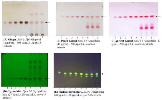 The following compounds were purchased from FUJIFILM Wako Pure Chemical Co. (Osaka, Japan): [6]-gingerol (Lot. APQ6161), amygdalin (Lot. KPM0958), glycyrrhizin (Lot. CAH4202), berberine (Lot. PTM0089), and (Z)-ligustilide (Lot. ESJ5922). The solvents used for HPLC and TLC analyses were of research grade. The TLC plate (Silica Gel 60 F254) was purchased from Merck Co. (Darmstadt, Germany).
