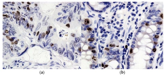 - Salminen, E.; Palmu, S.; Vahlberg, T.; Roberts, P.J.; Soderstrom, K.O. Increased proliferation activity measured by immunoreactive Ki67 is associated with survival improvement in rectal/recto sigmoid cancer. World J. Gastroenterol. 2005, 11, 3245–3249. [Google Scholar] [CrossRef] [PubMed]