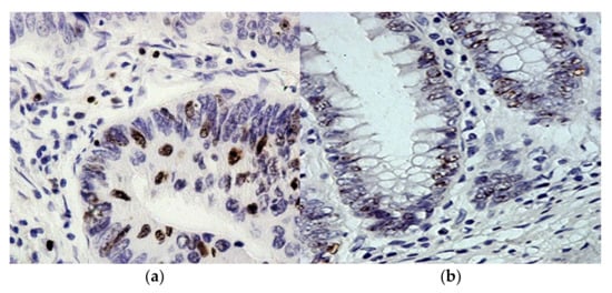 - Menezes, H.L.D.; Jucá, M.J.; Gomes, E.G.d.A.; Nunes, B.L.B.B.P.; Costa, H.O.; Matos, D. Analysis of the immunohistochemical expressions of p53, bcl-2 and Ki-67 in colorectal adenocarcinoma and their correlations with the prognostic factors. Arq. Gastroenterol. 2010, 47, 141–147. [Google Scholar] [CrossRef][Green Version]