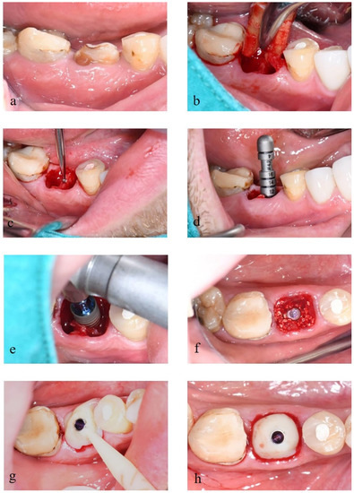 (a) Tooth #30 with crown-root fracture. (b) Tooth extraction with minimal traumatic technique. (c) Preparation of the implant bed using the pilot drill. (d) Use of depth gauge to check the implant axis and preparation depth. (e) Implant placement following the manufacturer’s instructions. (f) Placement of deproteinized bovine bone into the gap between implant fixture and socket. (g) Use of Variobase®® and ProtempTM 4 as the customized healing abutment. (h) Completed provisional restoration.