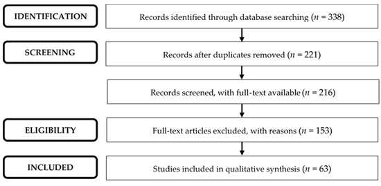 Applying the research expressions to Pubmed, Scopus, and Web of Science resulted in 338 studies, since 1994. Excluding duplicates and those for which it was not possible to access the full text, resulted in 216 studies for analysis. Some full-text articles were excluded because they did not meet the inclusion criteria, namely (1) without the plant Rosmarinus officinalis (n = 68); (2) without inflammation (n = 34); and (3) studies carried out in non-rodent animals (n = 4). Other full-text articles were excluded because they fit the exclusion criteria: (1) reviews, opinion articles, and clinical cases (n = 11); (2) exclusive studies with in vitro models (n = 34); and (3) studies with the associated plant (n = 2), as shown in Figure 1.