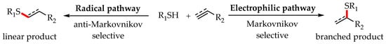 As mentioned above, owing to the high reactivity of sulfur, the thiol-ene/yne reaction preferred to proceed via a radical pathway. Hence, it is not surprising that the radical hydrothiolation to access anti-Markovnikov-type products under visible light has been well-developed until now. In contrast, the Markovnikov-selective hydrothiolation reaction still remains a great challenge. Due to the Kharasch effect [57,58] and the catalyst poisoning of metal catalysts by organosulfur compounds, only a few examples of photocatalyzed Markovnikov-selective hydrothiolation reactions have been reported.