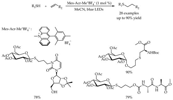 In 2017, Wang and co-workers reported a visible-light-promoted radical hydrothiolation of alkenes with thiols using 9-mesityl-10-methylacridinium tetrafluoroborate as photocatalyst [42]. The reaction proceeded smoothly with a variety of alkenes and thiols, giving the alkyl thioethers in excellent yields. Moreover, examples of the synthesis of glycoconjugates between glycosyl thiols and amino acid derivatives demonstrated the potential applicability of this strategy. Particularly, the coupling of glucose thiol with a nucleoside derivatives and dipeptide derivatives could afford the glyconucleoside and glycopeptide in good yields (Scheme 6).