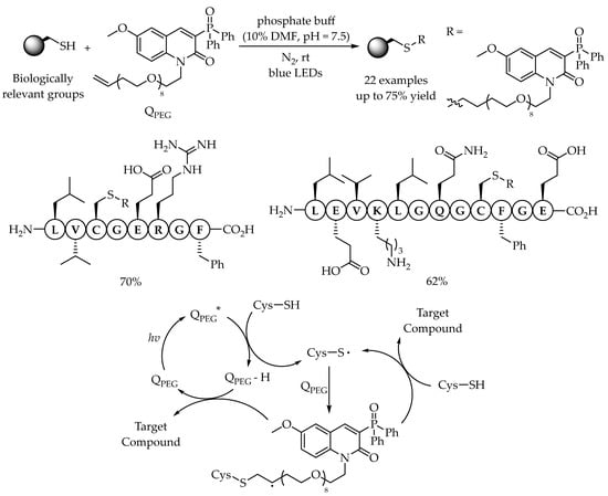 As one of the most promising cysteine modification methods, radical thiol-ene reaction for C-S bond formation was still limited because of the need for biocompatible reaction conditions. In 2020, Hong’s group discovered a visible-light-induced biocompatible thiol-ene reaction by using a fluorescent photosensitizer QPEG for cysteine-specific bioconjugation for the installation of QPEG [45]. The exclusion of external oxidant and base in this catalytic system inhibited the undesired reaction of peptide and protein substrates with high efficiency and functional group tolerance. Importantly, the fragments of endogenous proteins derived from insulin and Src kinase could be successfully conjugated with QPEG with the yields of 70% and 62%, respectively. From the mechanistic studies, it was assumed that, under blue LEDs irradiation, the triplet excited state of QPEG could abstract a hydrogen atom from the cysteine forming a thiyl radical. After the addition of the thiyl radical to the alkene QPEG, an alkyl radical intermediate could be formed, which would abstract a hydrogen atom from another thiol to give rise to the corresponding alkyl sulfide. Alternatively, this alkyl radical could also abstract a hydrogen atom from the intermediate QPEG-H to form the product and regenerate the ground-state QPEG to close the catalytic cycle (Scheme 9).
