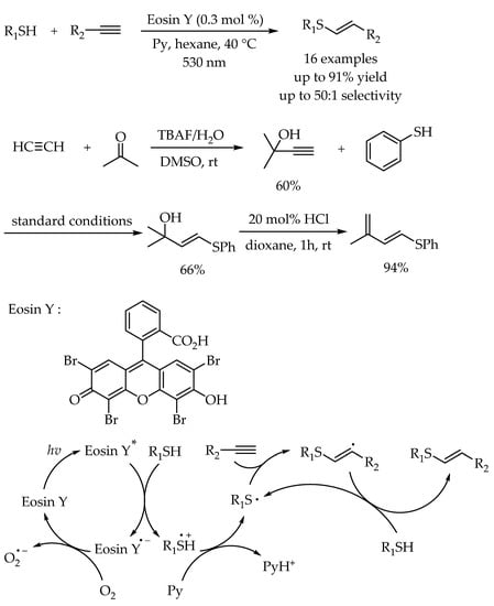 Visible-light-photocatalyzed thiol-yne reaction by Eosin Y.