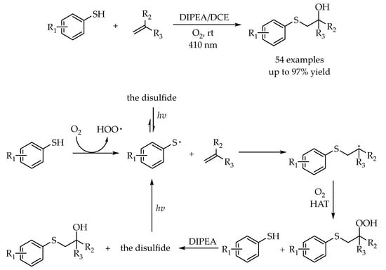 Recently, our group described a visible-light-promoted and tertiary-amine-assisted strategy for efficient hydroxysulfenylation of alkenes with thiophenols to selectively access β-hydroxysulfides in one-step [52]. Catalyst was unnecessary in this reaction and dioxygen was employed as a green oxidant. Various thiophenols and alkenes could participate in this transformation in good to excellent yields with good functional group tolerance. It is noteworthy that the alkenes with electron-withdrawing groups could also be efficient substrates in this protocol. Moreover, the successful hydroxysulfenylation of structurally complex vinyl-estrone under standard reaction conditions demonstrated that this protocol was a promising strategy for late-stage functionalization of natural products. According to the control experiments and mechanistic investigations, a reasonable reaction pathway was proposed. Under oxygen atmosphere, the thiophenol was first auto-oxidized to generate a thiyl radical, which could attack the alkene to afford an alkyl radical. Then, the generated radical intermediate could quickly react with dioxygen and then followed by a hydrogen atom transfer (HAT) to offer the hydroperoxyl sulfide, which could be in situ reduced directly to the β-hydroxysulfides in the presence of tertiary-amine. Light acting as a driving force played an important role in suppressing the generation of byproduct disulfides and promoted the reaction efficiency (Scheme 17).