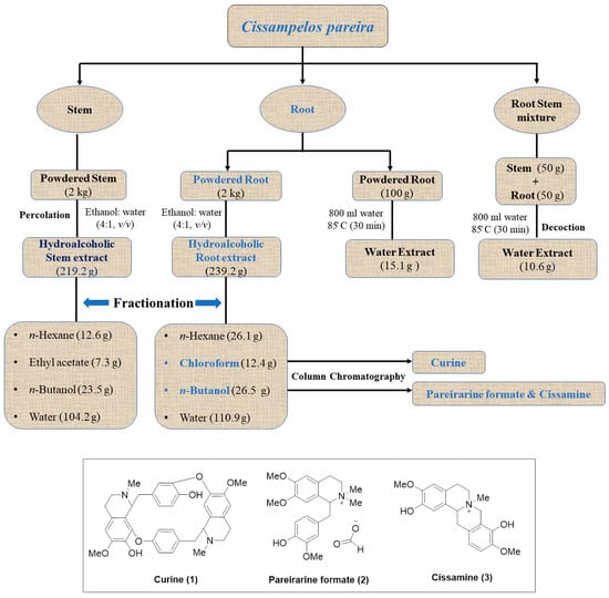 Schematic diagram showing complete steps involved in extraction, fractionation, and isolation of molecules from Cissampelos pareira.