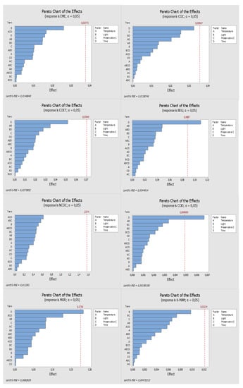 Pareto diagrams of the compounds under study, obtained when ascorbic acid was used as the preservative. The blue bars represent the effects of factors or a combination of factors: A—Temperature, B—Light, C—Preservative, and D—Time.