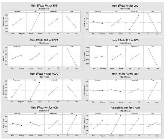 Figure 1, Figure 2, Figure 3 and Figure 4 show the results obtained with the multivariate study matrix. According to Figure 1, one can observe that time is a parameter with a significant influence on the stability of BEG, COD, and MOR when ascorbic acid is used. For the remaining compounds, none of the evaluated factors revealed a significant influence, since none of them crosses the 5% significance line. By analyzing the main effects plots (Figure 2), it is possible to observe that most of the compounds present apparently better response when stored refrigerated, although not significant, except for COC and MOR. Most of the target analytes also present a slightly better response in the absence of light, with exception of COD and MOR. Additionally, all compounds present greater response when a high concentration (600 ng/mL) of ascorbic acid is used. Moreover, the compounds present a lower response after 7 days in the DSS with a significant decrease shown for BEG. The exceptions were observed for COD, MOR, and 6-MAM. Although time was not a significant parameter for 6-MAM, it had a significant influence for COD and MOR which presented better responses after 7 days.