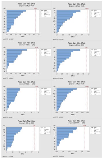 Pareto diagrams of the compounds under study, obtained when sodium fluoride was used as the preservative. The blue bars represent the effects of factors or a combination of factors: A—Temperature, B—Light, C—Preservative, and D—Time.