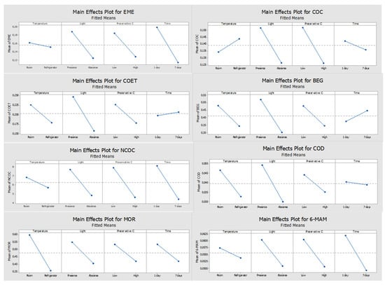 Main effects plots of the compounds when ascorbic acid was used as the preservative; The slope of the lines represents the effect of the response for the factors under study: temperature (room or refrigerator (4 °C)), light (presence or absence), preservative concentration level (low or high), and storage time (1 or 7 days).