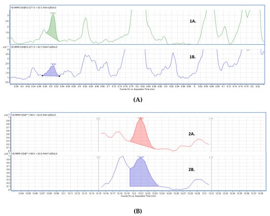 Chromatograms obtained for EME (A) and COET (B) for refrigerator temperature, absence of light, high concentration of preservative, day 1 (1A and 2A), and day 7 (1B and 2B) using sodium azide.