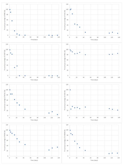 The percentage of analyte that was present in the extracts on each day of the study was determined for the purpose of assessing long-term stability and was calculated based on the verified variations from day 1, assuming that on this day the value was 100% for all analytes. The obtained results are shown in Figure 6.