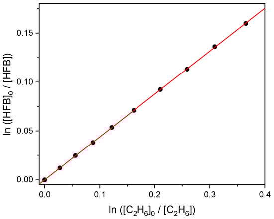 Spectral subtraction from the initial conditions yields the ratios [HFB]0/[HFB] and [C2H6]0/[C2H6], and an example plot is shown in Figure 3. The slope of Figure 3 corresponds to the ratio k1/k2 (see Section 4.2). The intercepts of unconstrained linear fits were not significantly different from zero, so the intercepts were fixed at zero. We report 2σ statistical uncertainties in the slopes in Table 2. With k2 = (5.7 ± 0.6) × 10−11 cm3 molecule−1 s−1 [2], we estimate k1 = 2.5 × 10−11 cm3 molecule−1 s−1. We further allow for up to 3% systematic error in the pressure measurements, and with the 7% uncertainty in k2 propose a 95% confidence interval of ±0.2 × 10−11 cm3 molecule−1 s−1 for k1.
