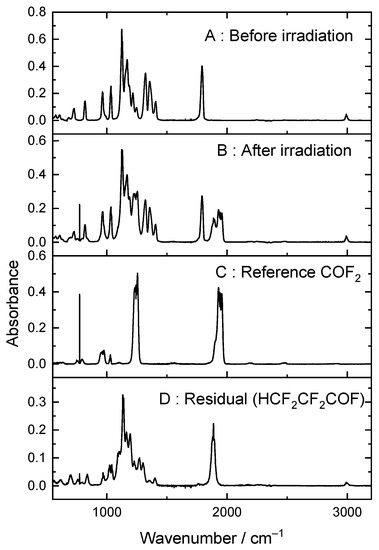 (A) Heptafluorobut-1-ene/Cl2/O2/Ar mixture before irradiation and (B) after irradiation, (C) a reference spectrum of COF2, and (D) the residual after subtracting unreacted HFB and COF2, assigned to tetrafluoropropanoyl fluoride (see text).