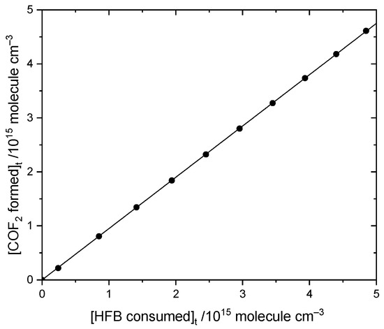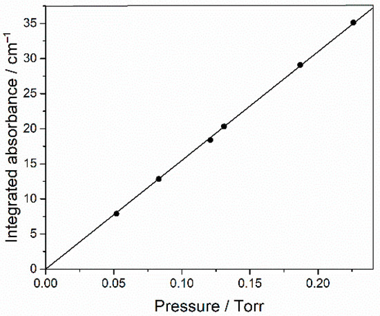 The reagents used were HFB (Synquest, Alachua, FL, USA, 97% purity), ethane (Praxair, Danbury, CT, USA, 99.9%) and Cl2 (Aldrich, St. Louis, MO, USA, >99.5% purity), which we purified by freeze-pump-thaw cycles with liquid nitrogen. O2 and Ar (Air Liquide, Pasadena, TX, USA, >99.99% purity) were used directly from their cylinders. Carbonyl difluoride was photochemically synthesized from a mixture of 13 mbar perfluorobutadiene, 7 mbar Cl2 and 130 mbar O2, and then unreacted starting materials and side products were trapped with a pentane/liquid nitrogen slush at 143 K. The integrated absorbance of a strong band at 1968.75–1907.75 cm−1 was measured for several partial pressures of COF2, made up to 1 bar with Ar. The proportionality shown in Figure 12 confirms the applicability of the Beer–Lambert law and the slope yields an integrated band strength (base e) of (4.56 ± 0.05) × 10−17 cm molecule−1.