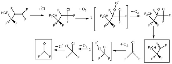 - Herath, T.N.; Clinch, E.C.; Orozco, I.; Raign, E.L.; Marshall, P. Relative rate and product studies of the reactions of atomic chlorine with tetrafluoroethylene, 1,2-dichloro-1,2-difluoroethylene, 1,1-dichloro-2,2-difluoroethylene, and hexafluoro- 1,3-butadiene in the presence of oxygen. J. Phys. Chem. A 2016, 120, 7311–7319. [Google Scholar] [CrossRef] [PubMed]