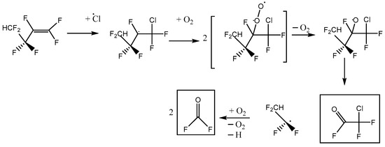 We note that a third reaction scheme is, in principle, possible, illustrated in Figure 10. This pathway leads to the net formation of two molecules of COF2 per molecule of HFB, plus chlorodifluoroacetyl fluoride. No C-Cl stretches were observed, and the yield of COF2~1, so Scheme C plays a minor role at best. In the alkoxy radical that appears in Schemes A and C, CF2HCF2CFO·CF2Cl, either C-C bond next to the oxygen atom can break. Density functional theory indicates that dissociation to make CF2Cl (Scheme A) is ca. 6 kJ mol−1 more favorable than making CF2HCF2 (Scheme C). This intermediate thermochemistry might drive the branching ratio toward Scheme A.