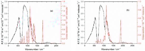 Earth’s radiation (RFE) plotted in black, left-hand scale. (a) Absorption cross sections of HFB in red, right-hand scale. (b) Absorption cross sections of TPF in red, right-hand scale.