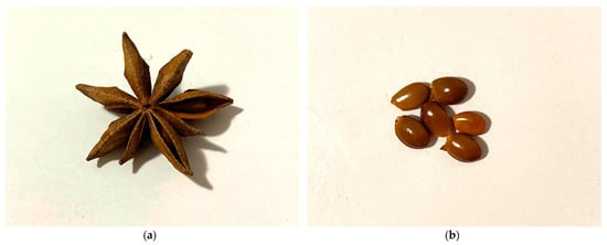 Illicium verum is an evergreen well-branched tree or shrub that measures around 8–15 m in height [4]. It was included in the Illiciaceae (Badianaceae) family in the older systematics. In the APG IV (2016) system, I. verum is classified under the genus Illicium belonging to the Schisandraceae family [6,7]. The bark of I. verum plants is white to light gray in color. The leaves are light green, lanceolate, leathery, and alternate, measure 6 to 12 cm long, and are located at the ends of branches [8,9,10]. The flowers are solitary, bisexual, white-yellow or greenish in color, and 1–7 cm in diameter. They grow either singly or arranged in clusters [8]. The fruit is star-shaped and has 6–10 capsule-like follicles with a small brown seed inside each (Figure 1). The seeds are ovoid with a shiny and smooth surface. Each part of the fruit carries an aromatic scent [8,10].