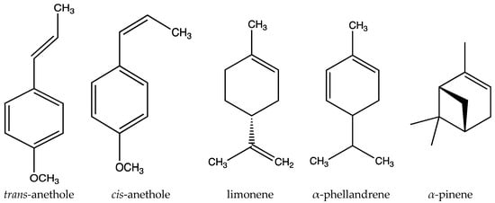 Trans-anethole is volatile and slightly soluble in water, but well soluble in ethanol. It is characterized by a sweet and herbal fragrance, and thus used in perfumery and the food, cosmetic, and pharmaceutical industries [5,42]. The CosIng database indicates that anethole (without specifying its isomeric forms) can be used as a fragrance or denaturant [37].
