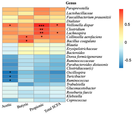 Pearson’s correlation between major microbiota and SCFA production at 24 h. * p < 0.05; ** p < 0.01; *** p < 0.005.