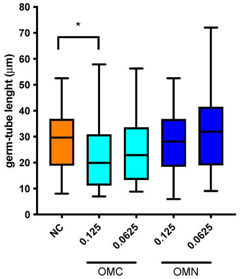 Based on the results of the germ-tube inhibition test obtained in three different hypha-induced media with two different concentrations of O. majorana OMN and OMC EOs (Table 3), we investigated the effect of both EOs on the length of the germ-tube. The results presented in Figure 2 show that only the OMC EOs at a concentration of 0.125 µg mL−1 significantly reduced the germ-tube length of C. albicans ATCC 90023 in the medium RPMI 1640 with an addition of 10% (v/v) FBS. Thus, OMC was able to modulate both the formation of germ-tubes and their length, contributing to the inhibition of one of the most important virulence factors of C. albicans.