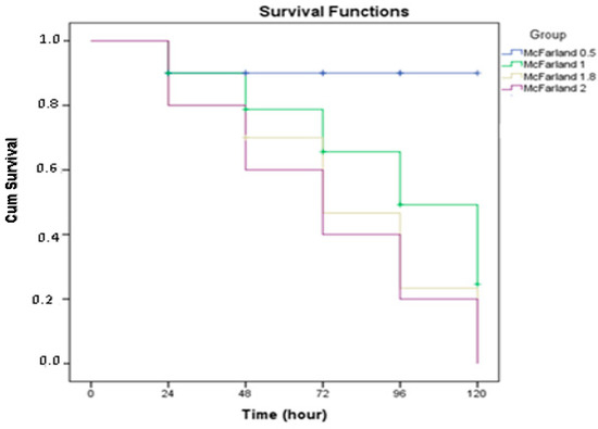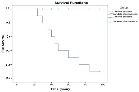 Larvae infected with C. albicans (6.0 × 108 cells) and treated with EO were examined after 24 h, 48 h, 72 h, and 96 h. The evaluation of the survival rate of larvae in the infected treatment group from the 24th hour showed that all larvae survived at the end of the 96th hour (Figure 4). The survival curves of the larvae are shown in Figure 5. The larvae of the control group infected with C. albicans (6.0 × 108 cells) and not receiving treatment also died in the controls carried out after 24 h. When the treatment group and the infected group were evaluated in terms of vital activities, it was found that the difference was statistically significant (p < 0.001).