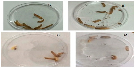 The groups of G. mellonella larvae: (A) Therapy group with 3.2 mg mL−1 O. majorana in G. mellonella larvae infected with an inoculum of 6.0 × 108 cells of C. albicans ATCC 90028 treatment for 24 h, (B) Therapy Group 1 with 3.2 mg mL−1 O. majorana EO in G. mellonella larvae infected with an inoculum of 6.0 × 108 cells of C. albicans ATCC 90028 treatment for 48 h, (C) Therapy Control Group 1 (3.2 mg mL−1 O. majorana EO), and (D) Therapy Control Group 2 (3.2 mg mL−1 O. majorana EO).