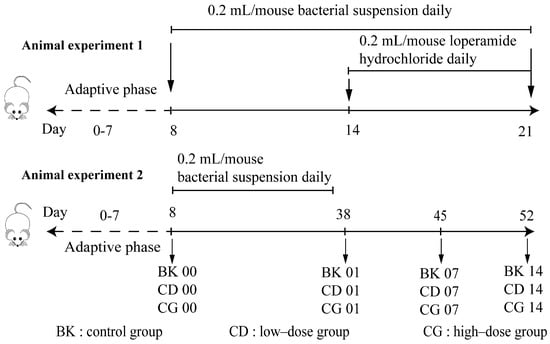 Six-week-old, male, SPF-grade BALB/c mice were obtained from Shanghai Slack Company. The animal experimental protocol was approved by the Ethics Committee of Jiangnan University (JN.No20190930b0600120) and implemented in accordance with existing EU guidelines (2010/63/EU). The breeding environment was maintained at a temperature of 23 ± 2 °C and relative humidity of 50 ± 10%, with a 12/12 h light/dark cycle. Fifty mice were randomly divided into a normal group, model group, positive group (Lactobacillus rhamnosus GG 0.1 g/kg BW bacterial suspension), low-dose group (0.1 g/kg BW bacterial suspension), and high-dose group (1.0 g/kg BW bacterial suspension)—ten mice per group. All animal experiments were performed in strict accordance with the regulations of the Animal Management and Use Committee of Jiangnan University (SYXK 2012-0002). The mice were gavaged daily after 7 days of adaptation to the environment. During days 8–14, mice in the normal and model groups were intragastrically administered 0.2 mL of saline solution, while the other groups were given 0.2 mL of bacterial suspension daily. All mice except for those in the normal were gavaged with loperamide hydrochloride daily (10 mg/kg BW) during days 15–21, while the mice in the normal group were orally administered saline solution daily. Low and high-dose groups were gavaged bacterial suspension continuously; the loperamide hydrochloride treatment was performed 1 h before bacterial suspension gavage daily on days 15–21 (Figure 1). The mice were anesthetized with isoflurane inhalation before pricking an eyeball for collecting blood. Carbon dioxide euthanasia and cervical dislocation were performed after blood collecting.