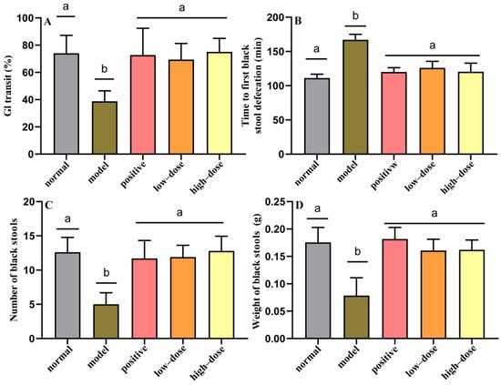 The time till the first black stool defecation represents motility throughout the intestine. Specifically, a shorter time till the first black stool defecation indicates more rapid whole intestinal tract motility and a stronger intestinal transport capacity. After 7 days of loperamide challenge, the time till first black stool defecation was significantly longer in the model group than that in the normal group (p < 0.05) (Figure 2B). Mice that received intragastric administrations of either low or high doses of probiotic compounds exhibited significantly shorter times to the first black stool defecation compared to the model group (p < 0.05). This result indicates that probiotic compounds can significantly improve the intestinal transit rate in constipation model mice by improving intestinal function and intestinal motility, thereby reducing the time till the first black stool defecation. However, there was no significant difference between the low and high-dose groups in reducing the time until the first black stool defecation. At the same time, the numbers and weights of black stools in the low and high-dose groups were significantly increased compared with the model group (p < 0.05), but there were no significant differences between the low and high-dose groups (Figure 2C,D).