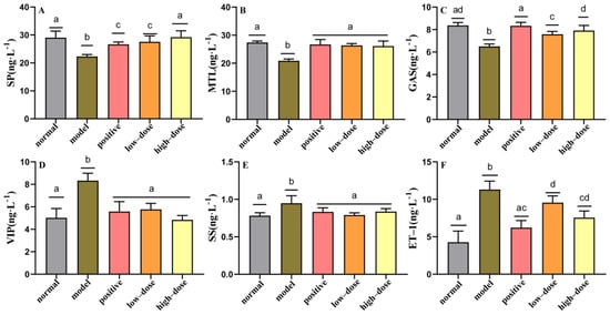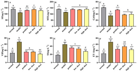 Effects of probiotic compounds on gastrointestinal peptides in the sera of constipated mice. (A) Substance P (SP); (B) motilin (MTL); (C) gastrin (GAS); (D) vasoactive intestinal peptide (VIP); (E) somatostatin (SS); (F) endothelin (ET–1). Data are means with SEM. a–d: Different letters indicate significant differences (p <0.05), and the same letters or no letters indicate no significant difference.