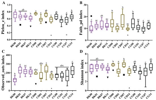 Treatment with probiotic compounds alters the diversity and structure of the gut microbiota. (A) α-Diversity index: Pielou_e. (B) α-Diversity index: Faith_pd. (C) α-Diversity index: Observed_otus. (D) α-Diversity index: Shannon. Normal group, BK; low-dose group, CD; high-dose group, CG; the first gavage, 00; the last gavage, 01; one week after stopping gavage, 07; two weeks after stopping gavage, 14. Statistical significance between groups is indicated by a–c, and different letters indicate that there was a significant difference between groups (p < 0.05, ANOVA, Tukey test).
