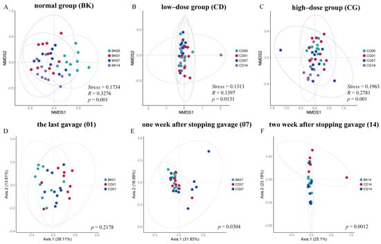 Based on three different β-diversity distances (Bray–Curtis), the composition of gut microbiota was analyzed after the first gavage, the last gavage, one week after stopping gavage, and two weeks after stopping gavage with different concentrations of probiotic compounds. NMDS based on the Bray–Curtis index was used to analyze the beta diversity of gut microbiota in the four groups. The β-diversity showed that there was no significant change in the gut microbiota between the group fed probiotic compounds and the control group at the first gavage (Supplementary Figure S3), but the β-diversity of gut microbiota changed significantly over time (p < 0.05) (Figure 6A–C). Such findings indicate that the probiotic compounds affected the overall structure of the gut microbiota. After stopping gavage for two weeks, the gut microbiota in both the CD and CG groups still demonstrated a significant change (p < 0.05). PCoA analysis showed that the compositions of gut microbiota in the CD and CG groups changed significantly after the last gavage and two weeks after stopping gavage compared with the first gavage (Figure 6B,C). One week after stopping gavage and two weeks after stopping gavage, the microbiota in the CD and CG groups were different from that of the BK (p < 0.05) (Figure 6E,F).
