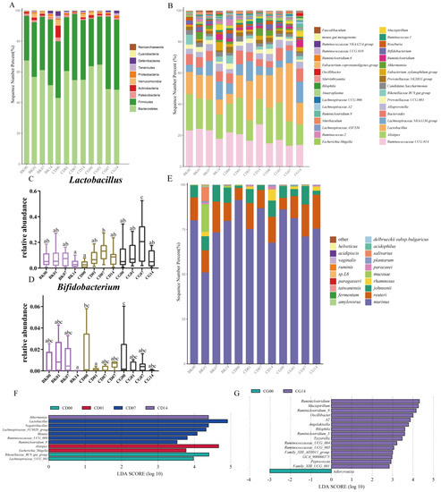 The effects of probiotic compounds on the composition of gut microbiota. (A) Microbial distribution at the phylum level. (B) Microbial distribution at the genus levels. (C,D) Relative abundances of the genera Lactobacillus and Bifidobacterium. Statistical significance between groups is indicated by a–c: different letters indicate that there is a difference between groups (p < 0.05, ANOVA, Tukey test). (E) Treatment with different concentrations of probiotic compounds altered the gut microbiota at the Lactobacillus species level. (F) Effects of low-dose probiotic compounds on the gut microbiota of mice at different times. (G) Effects of high-dose probiotic compounds on the gut microbiota of mice at different times. Normal group, BK; low-dose group, CD; high-dose group, CG; the first gavage, 00; the last gavage, 01; one week after stopping gavage, 07; two weeks after stopping gavage, 14.