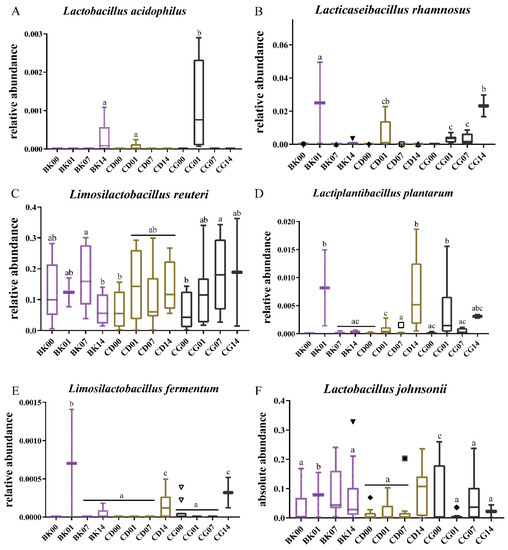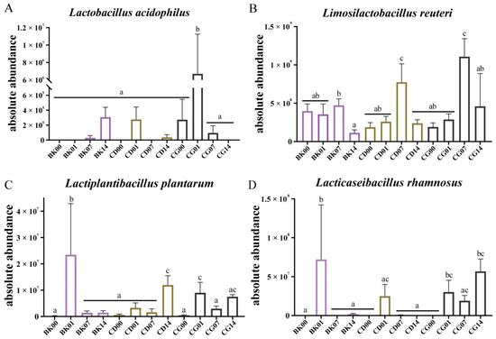Absolute abundances of the Lactobacillus species with respect to the effects of probiotic compounds. Probiotic compounds included (A) Lactobacillus acidophilus; (B) Limosilactobacillus reuteri; (C) Lactiplantibacillus plantarum; (D) Lacticaseibacillus rhamnosus. Normal group, BK; low-dose group, CD; high-dose group, CG; the first gavage, 00; the last gavage, 01; one week after stopping gavage, 07; two weeks after stopping gavage, 14. Statistical significance between groups is indicated by a–c: different letters indicate that there is a difference between groups (p < 0.05, ANOVA, Tukey test).