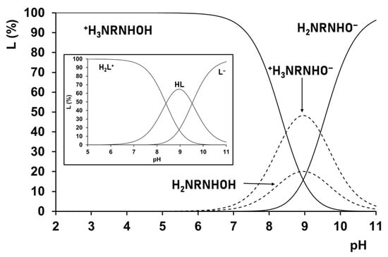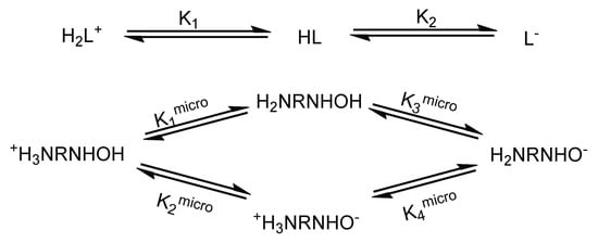 For the imidazole derivatives, NMR results clearly supported that the lower dissociation constants belong to the deprotonation of the imidazolium-N(3)H+, while the higher ones belong to the hydroxamic functions. Moreover, the existence of hydrogen bonding between the non-protonated imidazole-N and hydroxamic-NH was supposed from the surprisingly low pK1 of H2-Imcha+ [81]. Unlike the imidazole derivatives, all of the results for the derivatives of the amino acids and peptides supported the significant overlapping of the two deprotonation steps [34,37,82,83]. In such cases, only the dissociation micro constants (pKmicro), which can be determined by the selective monitoring of the dissociation of the individual group(s), and are characteristic for the individual processes shown in the heading of Table 1. As a representative example, the schematic presentation of the difference between the macroscopic and microscopic dissociation processes and pH-dependent speciation profile for H2-β-Alaha+ are seen in Figure 2.