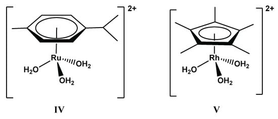 - Bíró, L.; Godó, A.J.; Bihari, Z.; Garribba, E.; Buglyó, P. Tuning the hydrolytic properties of half-sandwich-type organometallic cations in aqueous solution. Eur. J. Inorg. Chem. 2013, 3090–3100. [Google Scholar] [CrossRef]